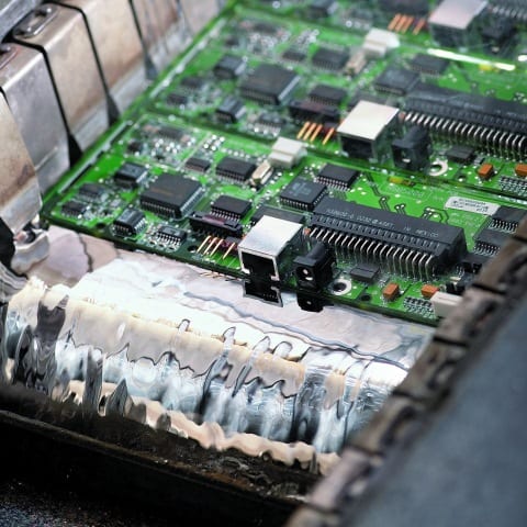 Back To TopThe wave solder process is utilized for large-scale lead soldering of circuit boards after the placement of through hole components has been completed.